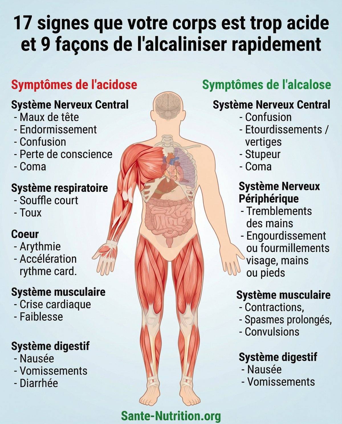 Un corps acide est un corps en mauvaise santé. Lorsque le corps est acide, il crée un environnement non souhaité où la maladie, les bactéries et les levures se développent. Lorsque le corps est trop acide, le corps prend des minéraux aux organes vitaux et aux os pour neutraliser l’acide et l’extraire de l’organisme. Pour cette raison, les réserves minérales de l’organisme, tels que le calcium, le sodium, le potassium et le magnésium peuvent devenir dangereusement basses et causer des dommages qui peuvent passer inaperçus pendant des années, jusqu’à ce que l’organisme atteigne des niveaux malsains, provoquant l’acidose.