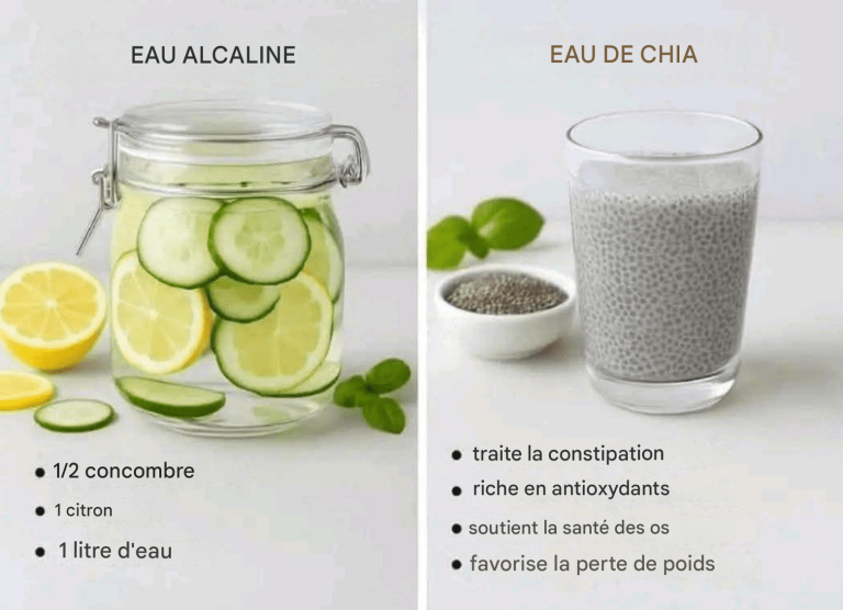 Cette combinaison tonique aide à neutraliser l’acidité du corps et favorise la détoxification. Le concombre hydrate et réduit l’inflammation, tandis que le citron stimule le système immunitaire et facilite la digestion. C’est une boisson rafraîchissante et revitalisante pour bien commencer la journée.