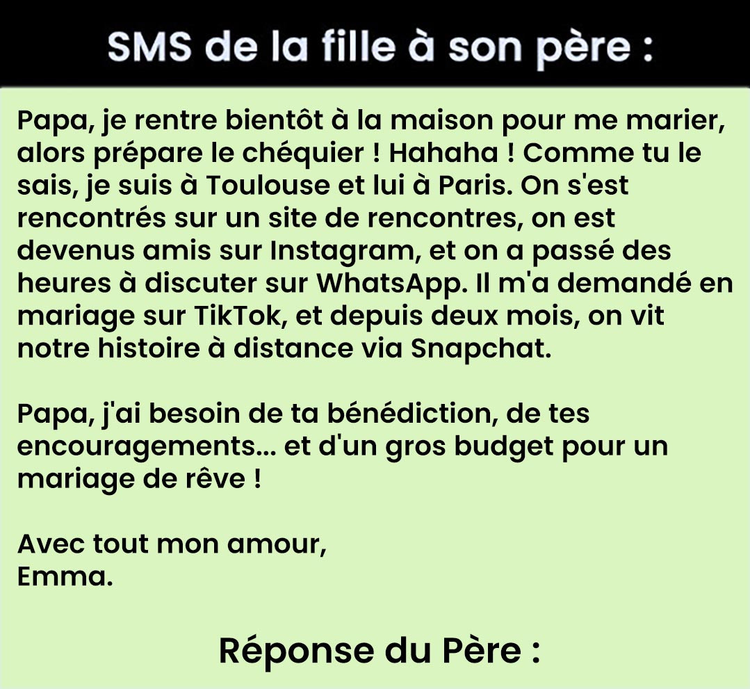 « Papa, je vais bientôt rentrer à la maison pour me marier, alors prépare ton chéquier ! Haha !