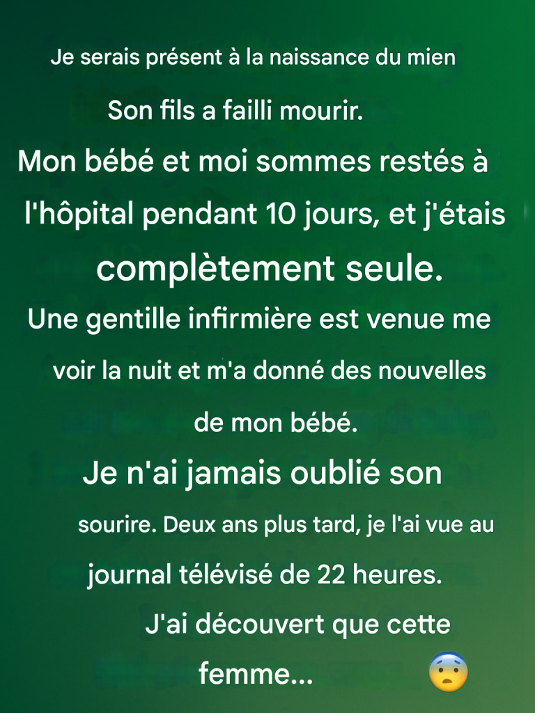 Une infirmière s’est glissée — des pas doux, des yeux chaleureux, ce sourire calme qui me faisait sentir que je pouvais à nouveau respirer. Elle s’est assise à côté de moi, parfois en train de me parler, parfois elle m’a juste tenu compagnie pendant que je pleurais involontairement.