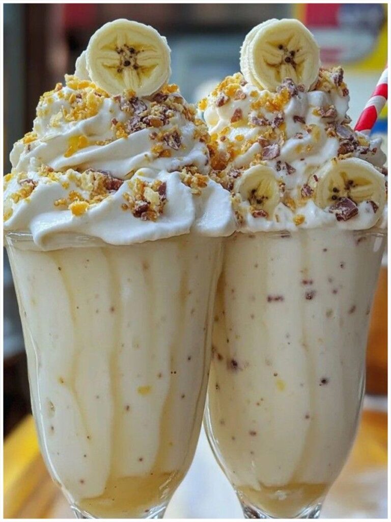 3 bananes mûres 400 ml de lait froid (lait entier ou alternatif végétal) 2 à 3 boules de glace à la vanille 1 cuillère à soupe de miel ou de sirop d’érable (facultatif, selon la douceur des bananes) 100 ml de crème fouettée 1 à 2 cuillères à soupe de noix cassantes ou hachées 1 à 2 cuillères à soupe de pépites de chocolat hachées ou de copeaux de chocolat Quelques tranches de banane pour la décoration