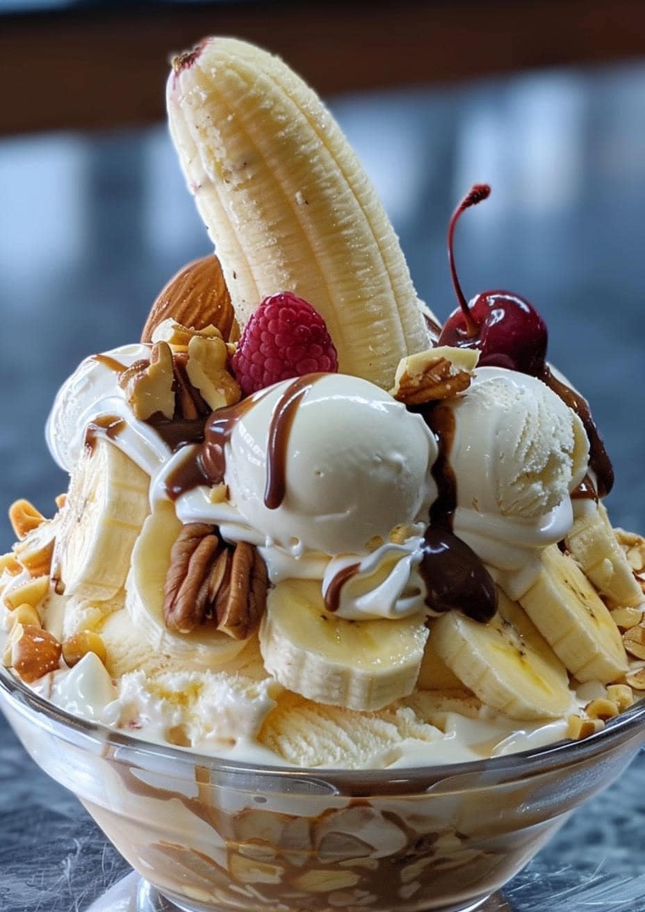 Savourez une délicieuse et gourmande coupe glacée qui combine les saveurs d’un banana split avec des noix croquantes pour une expérience de dessert parfaite.