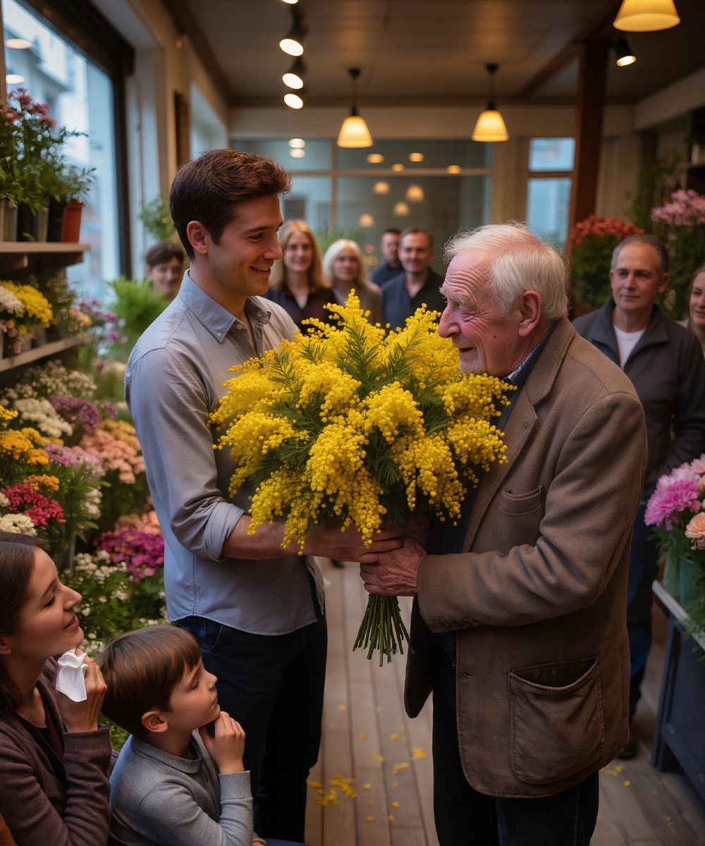 Il entra dans une boutique de fleurs avec seulement trente euros en poche, espérant acheter une simple branche de mimosa pour la femme qu’il aimait et qu’il avait perdue. Mais lorsque la vendeuse se moqua de lui et lui tendit une tige fanée, je décidai de lui donner une leçon qu’elle n’oublierait jamais, et ce qui se passa ensuite laissa le magasin tout entier sans voix.